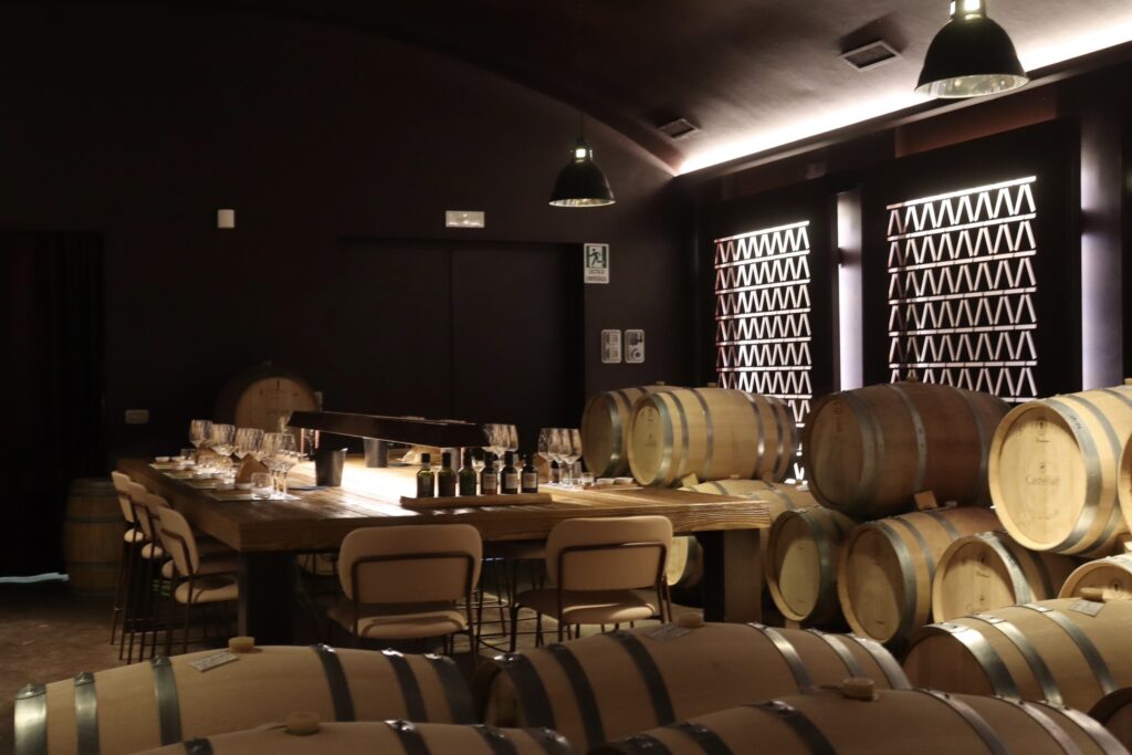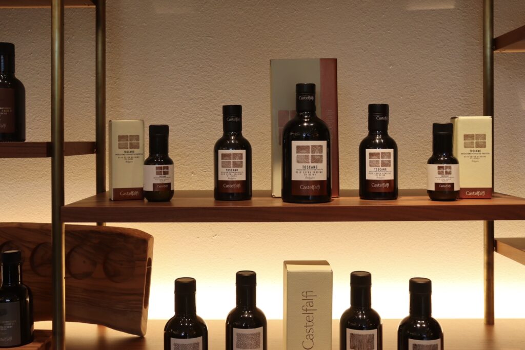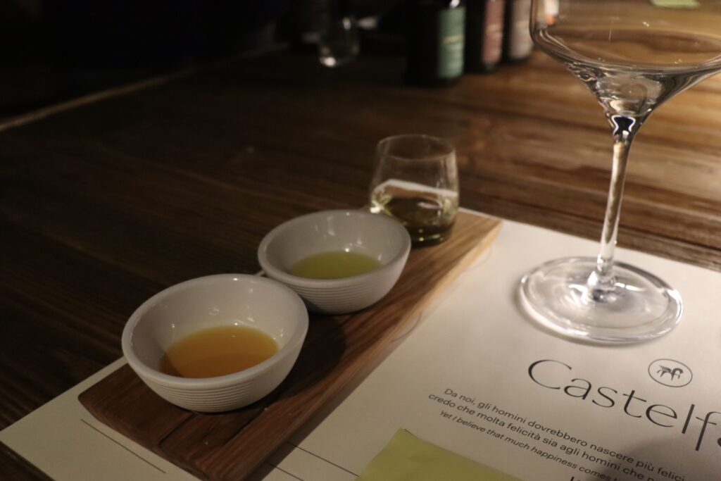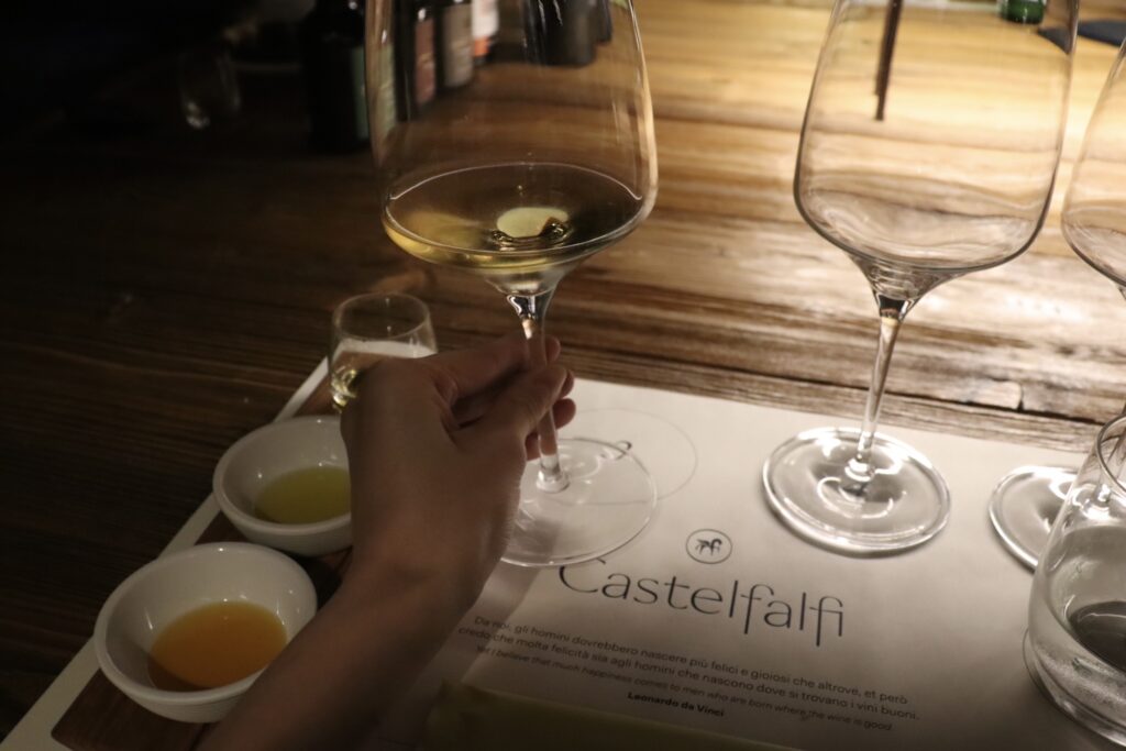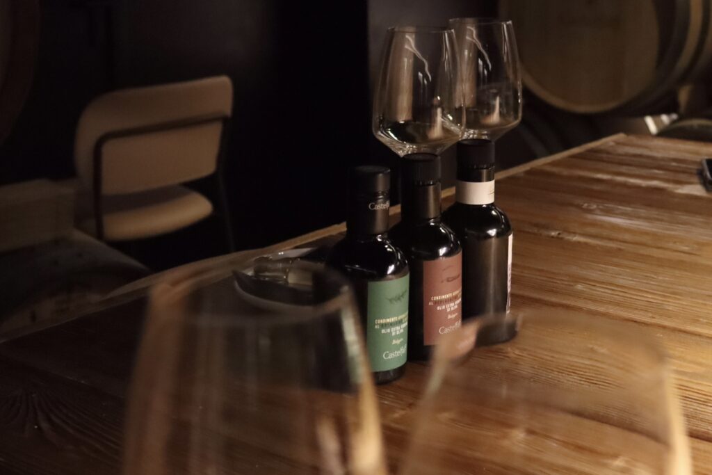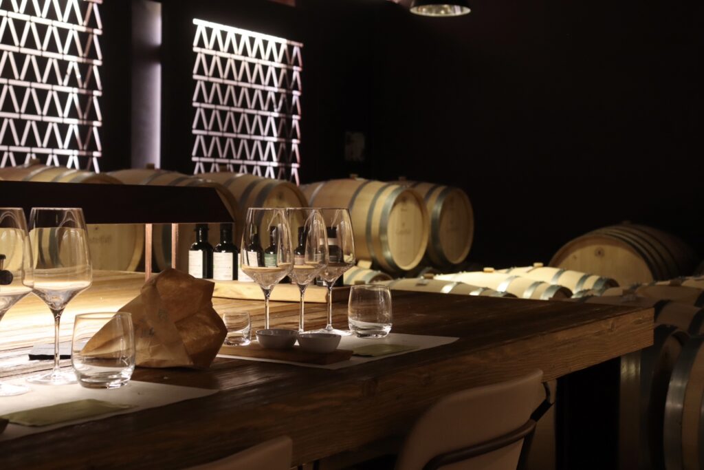 ワインやオリーブオイルのテイスティングは静かな地下の空間で感覚を研ぎ澄ます体験。