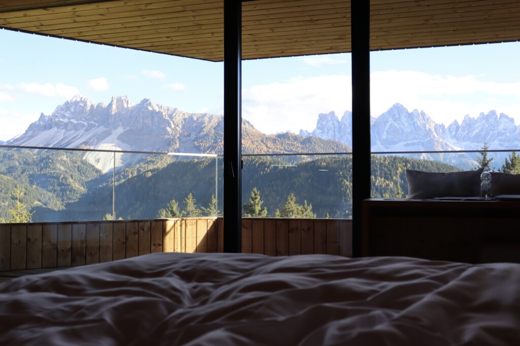 大きな窓からは世界遺産のドロミテ峰が目の前に広がる。