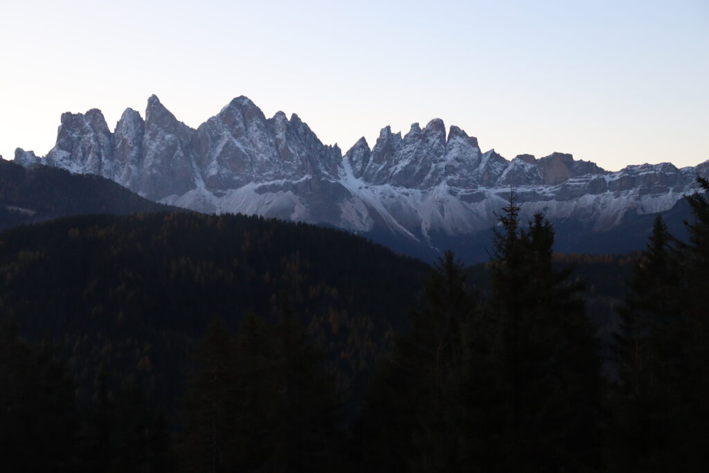 夕暮れはドロミテの稜線が紫から紺へ溶けていき、
