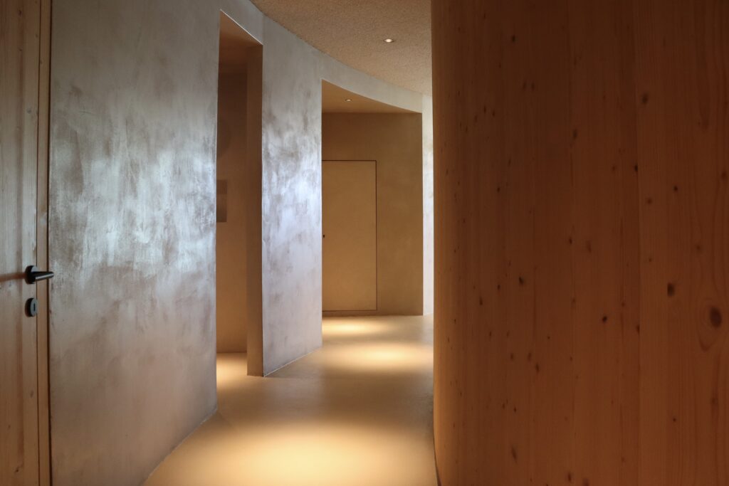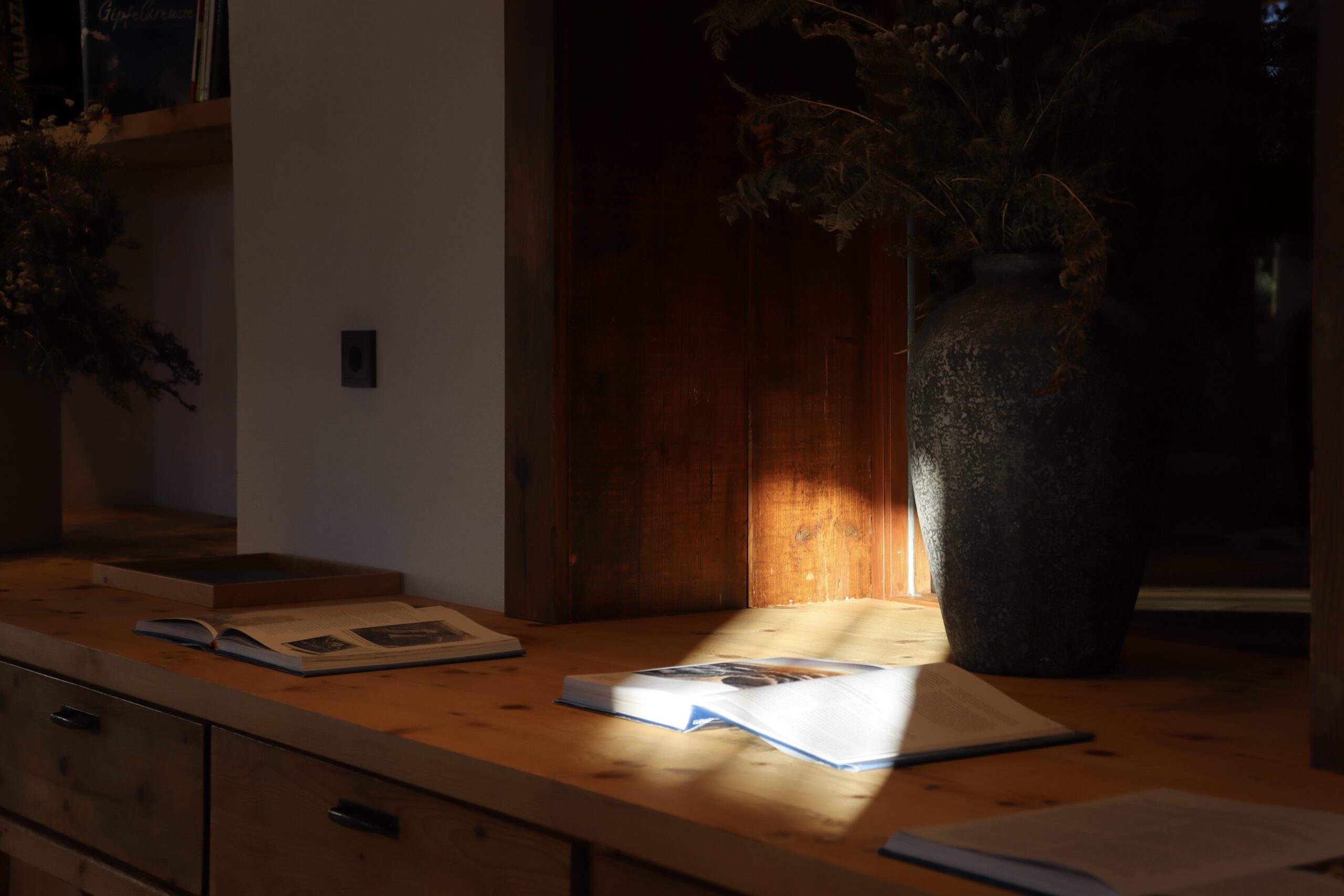 至るところにある大きなガラス窓、あるいは石の床や壁が、森と山の光と影をゆっくりと映し出す。