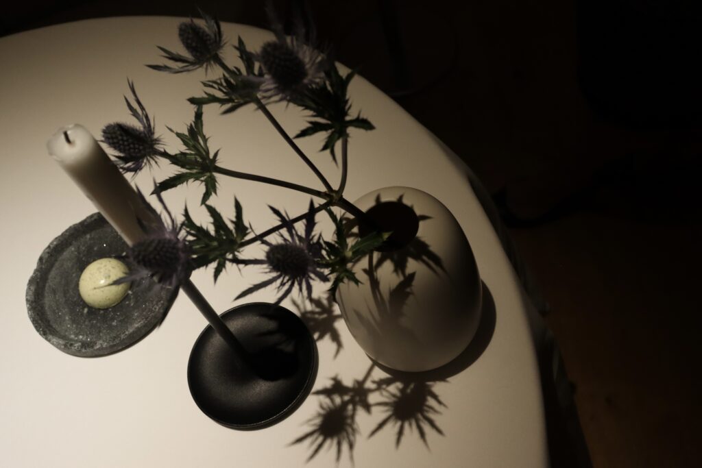 石は雪山の静けさを宿すような質感で空間に深度を与え、